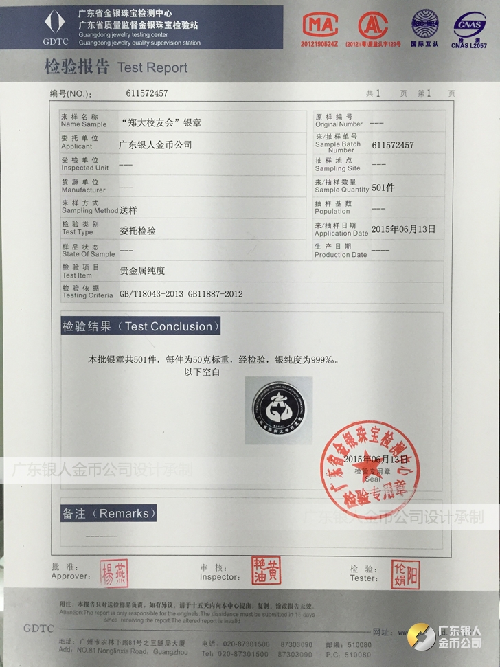 廣東銀人金幣公司承接客戶個(gè)性化定制的金銀幣、金銀章、金銀條、金銀牌、金銀盤(pán)均由國(guó)家質(zhì)監(jiān)部門(mén)、嚴(yán)格檢測(cè)、權(quán)威鑒定: