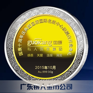 2015年9月定制 深圳國康純銀包金紀念幣定制、純銀鑲純金幣定制