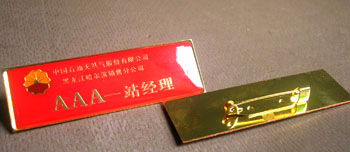中國石油黑龍江省哈爾濱市銷售分公司——公司下轄各地加油站工作人員胸牌、加油員胸牌、站經理奧瑪板胸牌、復核員工號牌、計量員工牌、油站營業員奧瑪板工牌的設計與制作。