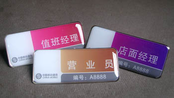 中國移動通信集團甘肅省白銀市分公司——為中國移動白銀市公司屬下全市營業(yè)廳制作移動公司胸牌、營業(yè)員胸牌、值班經理胸牌、社會渠道經理胸牌、店長員胸牌、店員胸牌。